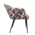 Elegant pink accent chair with floral printed back and black legs – a perfect blend of vintage flair and modern design.