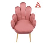 stylized hand-shaped accent chair in dusty pink velvet with gold-finished metal legs. A luxurious and whimsical statement piece blending art deco and modern design