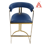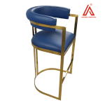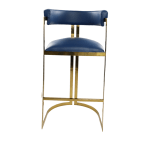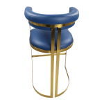 Stylish blue leather bar stool with a gold-tone metal frame. Modern design with a curved base, integrated armrests, and a sleek, minimalist look. Perfect for bars and high counters