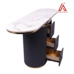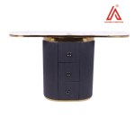 Enhance your living space with our Modern Cylindrical Side Table, featuring a luxurious white marble top with gray veining and a textured dark gray or charcoal base. The table is accented with elegant gold or brass-colored metal trim, adding a touch of sophistication. Crafted from high-quality materials, the top is made from marble or a marble-effect material, while the base is designed with a ribbed texture, possibly from fabric or wood. This side table includes three integrated drawers on one side, with light wood-tone interiors, providing practical storage solutions. The oval tabletop extends beyond the cylindrical base, offering ample surface area. Combining functionality with aesthetic appeal, this side table is perfect for use in living rooms, bedrooms, or office settings.